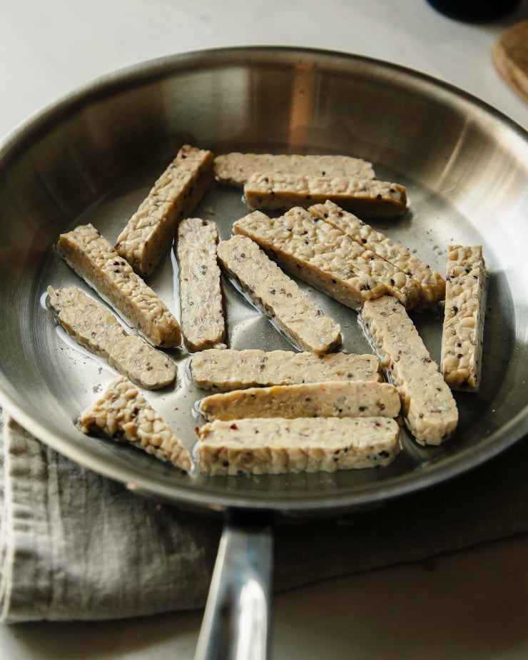 - Make the sticky ginger tempeh. Cover the bottom of a medium skillet with water and place it on the stove over medium heat. Once itโs simmering, add your tempeh slices and cover. Steam the tempeh for 10 minutes. Remove the tempeh from the skillet with tongs and place it on a plate to cool. Rinse the skillet and wipe it out. Youโll be using it to finish the tempeh.