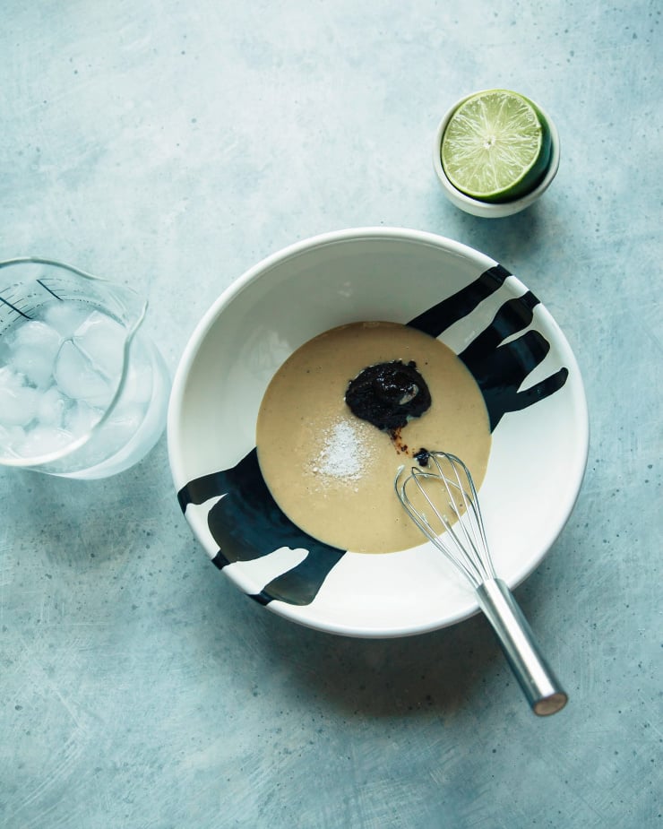 - Prepare the chile lime tahini sauce. In a medium bowl, whisk together the tahini, adobo sauce, lime juice, and salt. Then, add the ¼ cup ice water. Slowly whisk to combine and then speed up your whisking. The sauce should become slightly pale and be fluid enough to drip off of your whisk. Add more ice water by the tablespoon if necessary. Check the sauce for seasoning, adjust, and then set aside.