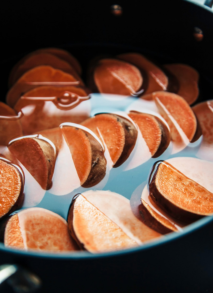 - Slice the sweet potatoes crosswise into ½ inch thick slices. Place the sweet potato slices in a large pot and cover with water. Put a lid on the pot and bring the sweet potatoes to a boil. Let the sweet potatoes boil until they yield to the prick of a paring knife with minimal pressure, about 4 minutes.