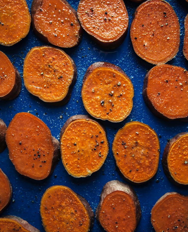 - Lay the par-boiled sweet potato slices out on a baking sheet in a single layer. Spray the sweet potatoes with your oil spray and season them with salt and pepper. Flip the slices over and repeat with the other side.
