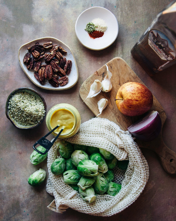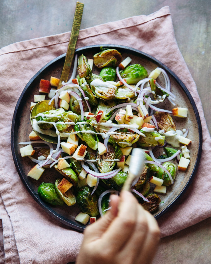 - Assemble the salad! Transfer the warm roasted brussels sprouts to your serving plate. Scatter the chopped apple and red onion around. Drizzle some of the dressing over the top and finish with the smoky pecan crumble. Sprinkle a bit of salt and freshly ground black pepper over the top too! Enjoy the loaded brussels sprouts salad immediately