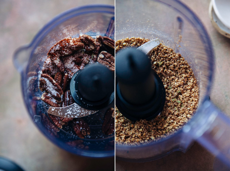 - Make the smoky pecan crumble. In a mini food processor, regular food processor, spice grinder, or mortar and pestle, combine the toasted pecan halves, smoked paprika, onion powder, coconut palm sugar, fennel seeds (if using), and big pinches of salt and pepper. Pulse/grind until you have a coarse bread crumb texture. Set aside.