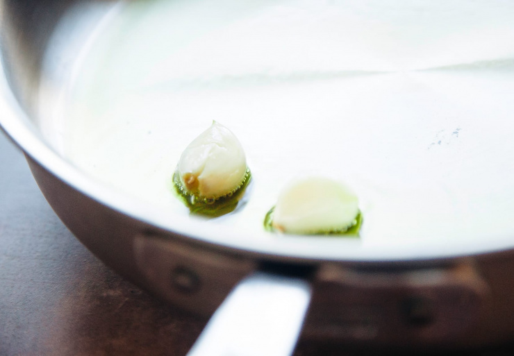 - Set a large, oven-safe sauté pan over medium heat. Once it’s warm, pour in the olive oil and add the garlic cloves to the pan. Sauté the garlic cloves until they are well-browned on all sides, about 3 minutes. Retrieve the garlic cloves from of the pan (leaving the oil behind) and transfer them to an upright blender.