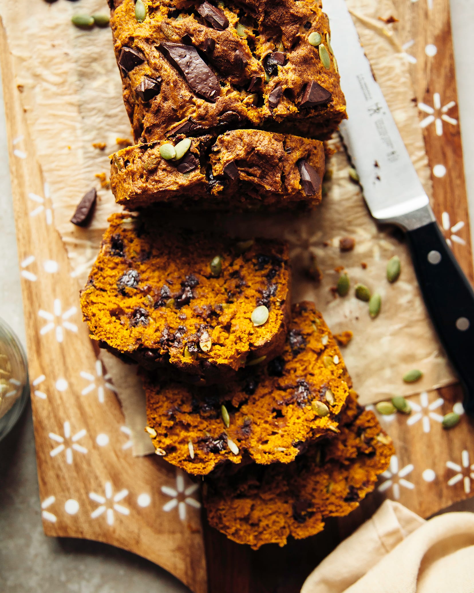 This pumpkin loaf with spelt flour isn’t too sweet. Of course chocolate brings things up a bit, but the loaf itself is naturally sweetened with just the right amount of maple syrup. Any liquid sweetener will work in its place. I used pumpkin seeds as an add-in to stay on theme, but toasted pecans or walnuts would be incredible.