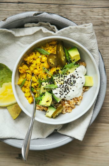Farro Breakfast Bowl with Turmeric & Scallion Scrambled Chickpeas