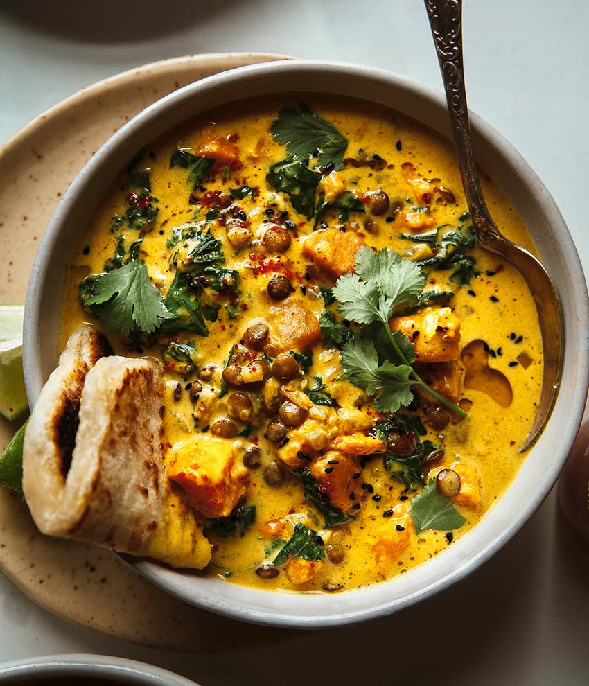 - Ginger Sweet Potato Coconut Milk Stew with Lentils & Kale