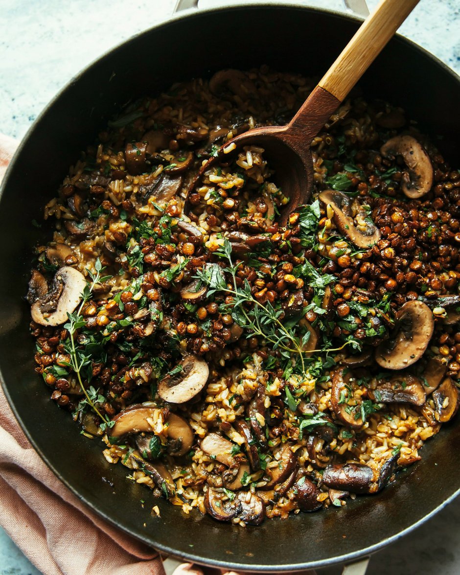 - Mushroom Brown Rice Bake with Caramelized Shallots, Crispy Lentils & Gremolata